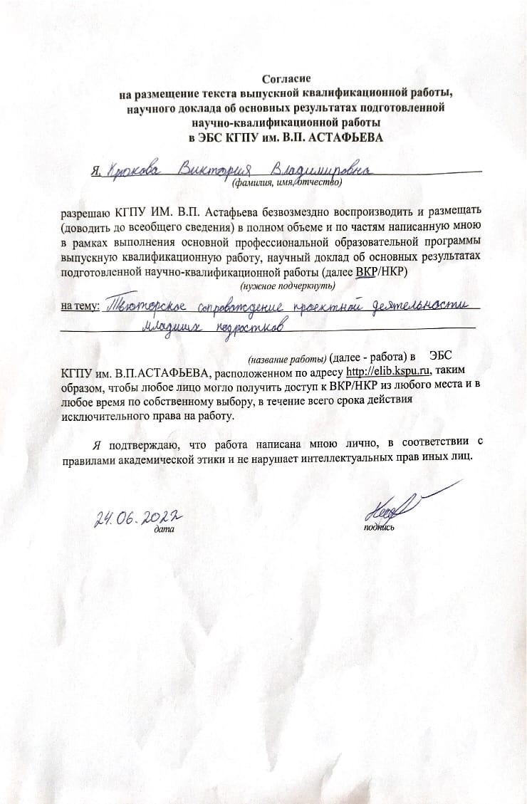 Крюкова Виктория Владимировна Тьюторское сопровождение проектной деятельности младших подростков