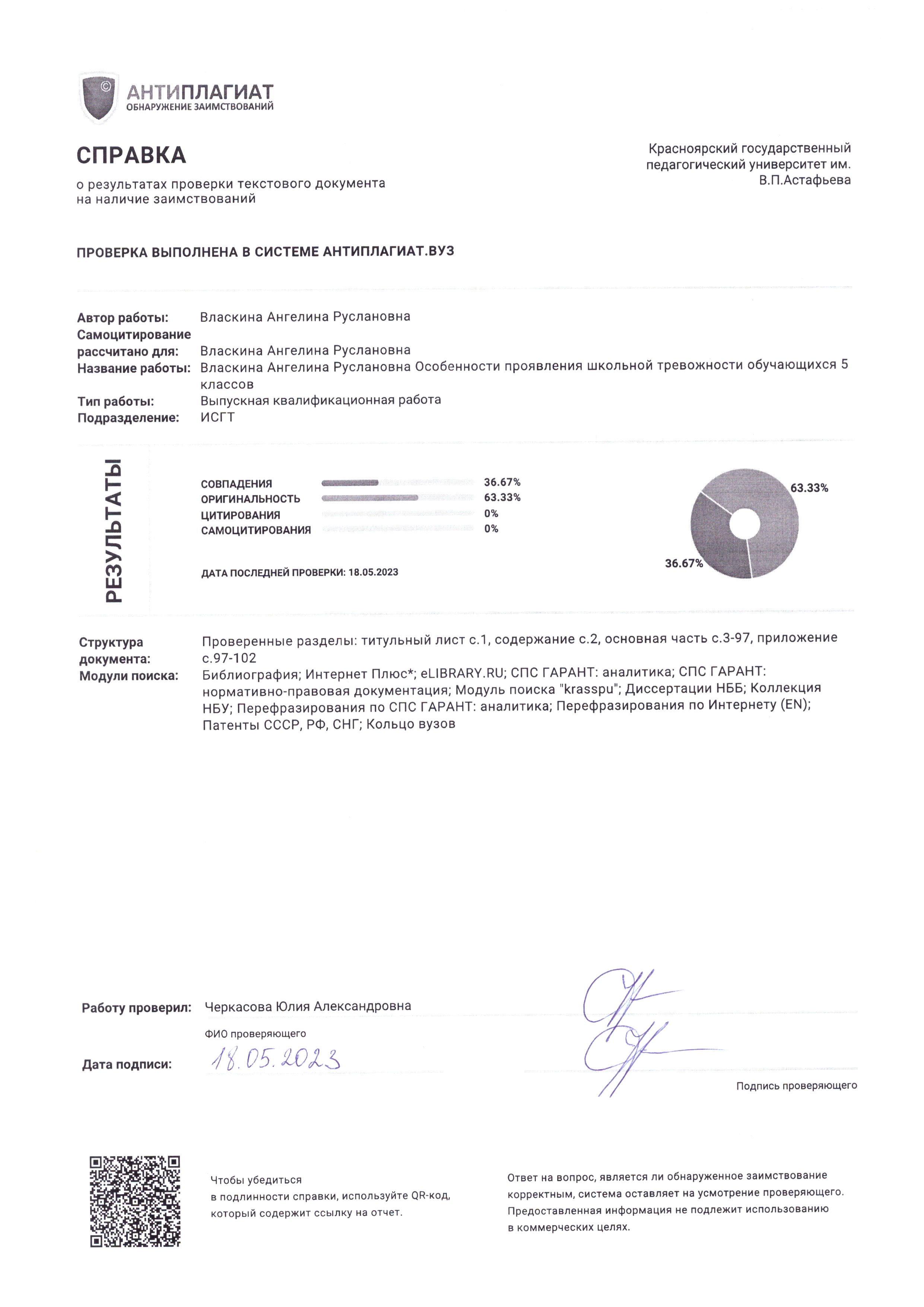 Власкина Ангелина Руслановна Особенности проявления школьной тревожности обучающихся 5 классов в период адаптации к основной школе