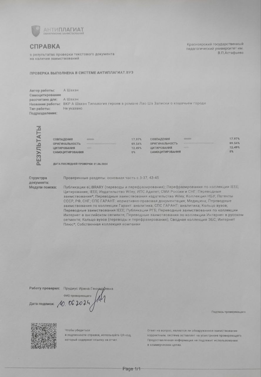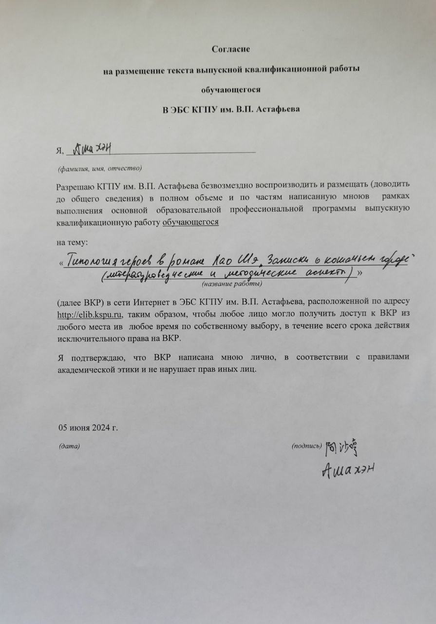 «Типология героев в романе Лао Шэ “Записки о кошачьем городе” (литературоведческий и методический аспекты)»